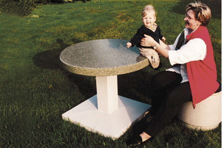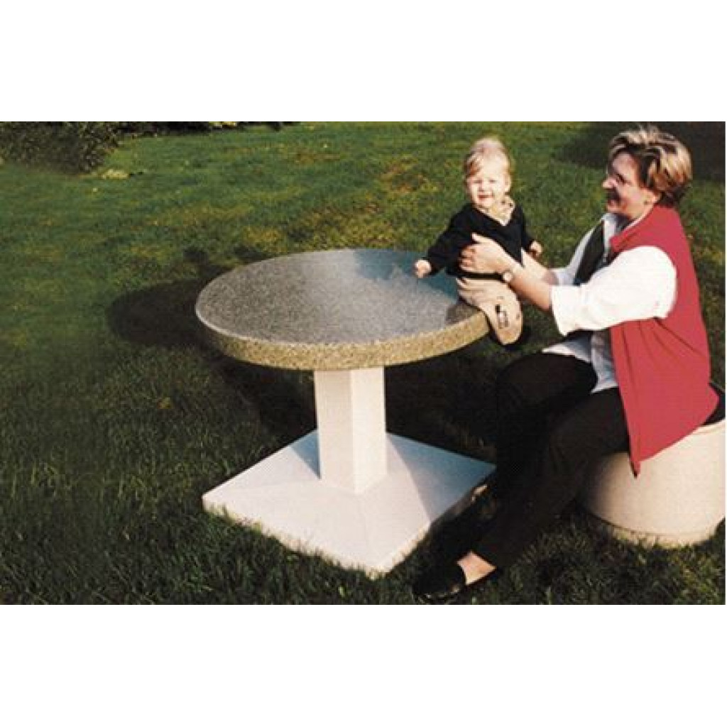 Spillbord "Max" Spillbord "Max" Plate Ø: 98 cm Høyde: 80 cm Tykkelse: 10 cm Fot: 75 x 75 cm Vekt: ca. 288 kg Spilleplate av grønn edelsten, finslipt og forseglet vannfast. Søyle og fot av betong