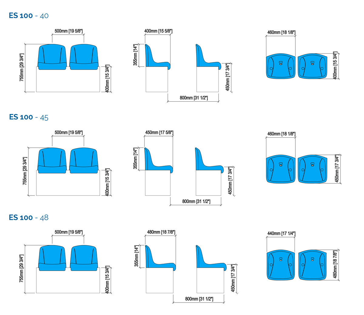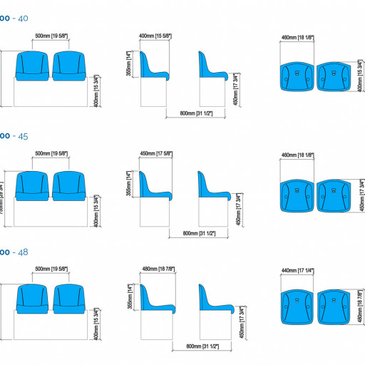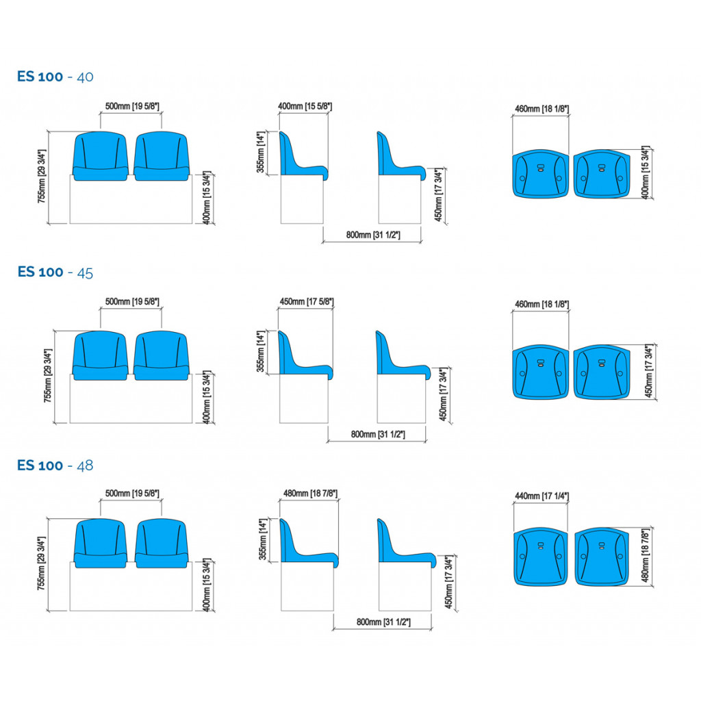 ES 100 tribunestol Et enkelt kvalitetssete, i formstøpt polypropylen med dobbel innervegg i rygglenet for maksimal støtte. Tribunesetet er designet for bruk på sportsarenaer og -sentre, enten det er utendørs eller innendørs. Dimensions 46-52 cm seat