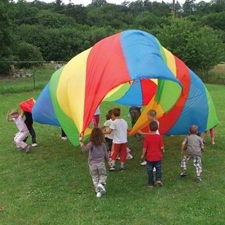 Kjempefallskjerm i gul, rød, blå og grønn nylon (Astol-vev) med doble sømmer og 15 cm hull i midten. Super til samarbeidsøvelse for 10 - 18 personer. Ønsker du en annen størrelse? Ta kontakt med oss!