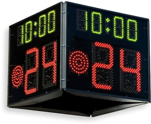 24-sekundersanlegg med skuddklokke og spilletid. 4-sidig display. Ideell for basketball. FS-24s-4B, 24-second shot clock with game time, 4-SIDED 24-sekundersanlegg med skuddklokke og spilletid. 4-sidig display. Ideell for basketball. Indicator of 24 seconds and game time, Display on 4 sides.