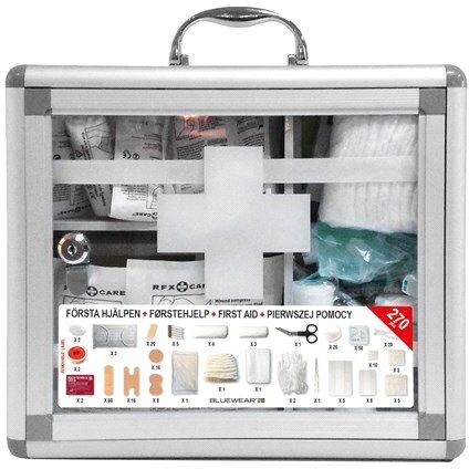 Det inneholder trekantformet bandasje (136 x 96 x 96 cm), 3 elastiske bandasjer (4 m x 6 cm), 4 elastiske bandasjer (4 m x 8 cm), 6 selvklebende bandasjer (10 x 7 cm), selvklebende bandasje (10 x 6 cm), kompresjonsbandasje (20 x 10 cm), 5 kompresser (10 x 10 cm), 5 kompresser (7,5 x 7,5 cm), 10 kompresser (5 x 5 cm), 120 plastplaster (72 x 19 cm), 10 plastplaster (40 x 10 cm), 8 plastplaster (Ø 24 mm), 8 plastplaster til knoker, 4 plastplaster (40 x 70 mm), 50 antiseptiske våtservietter (30 x 30 mm), 2 munnbind, 2 masker, 2 øyelapper, 20 bomullspinner (8 cm), 20 bomullsdotter, bomull (30 g), 2 teipruller (5 m x 1,25 cm), 5 sikkerhetsnåler, saks, pinsett (metall) og to par hansker. Det følger også med to nøkler til skapet.