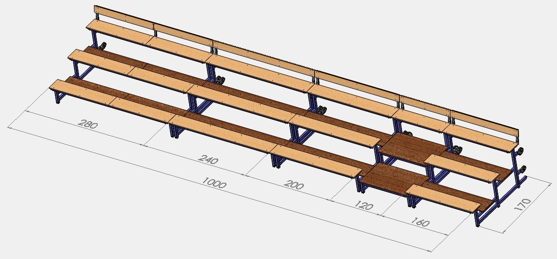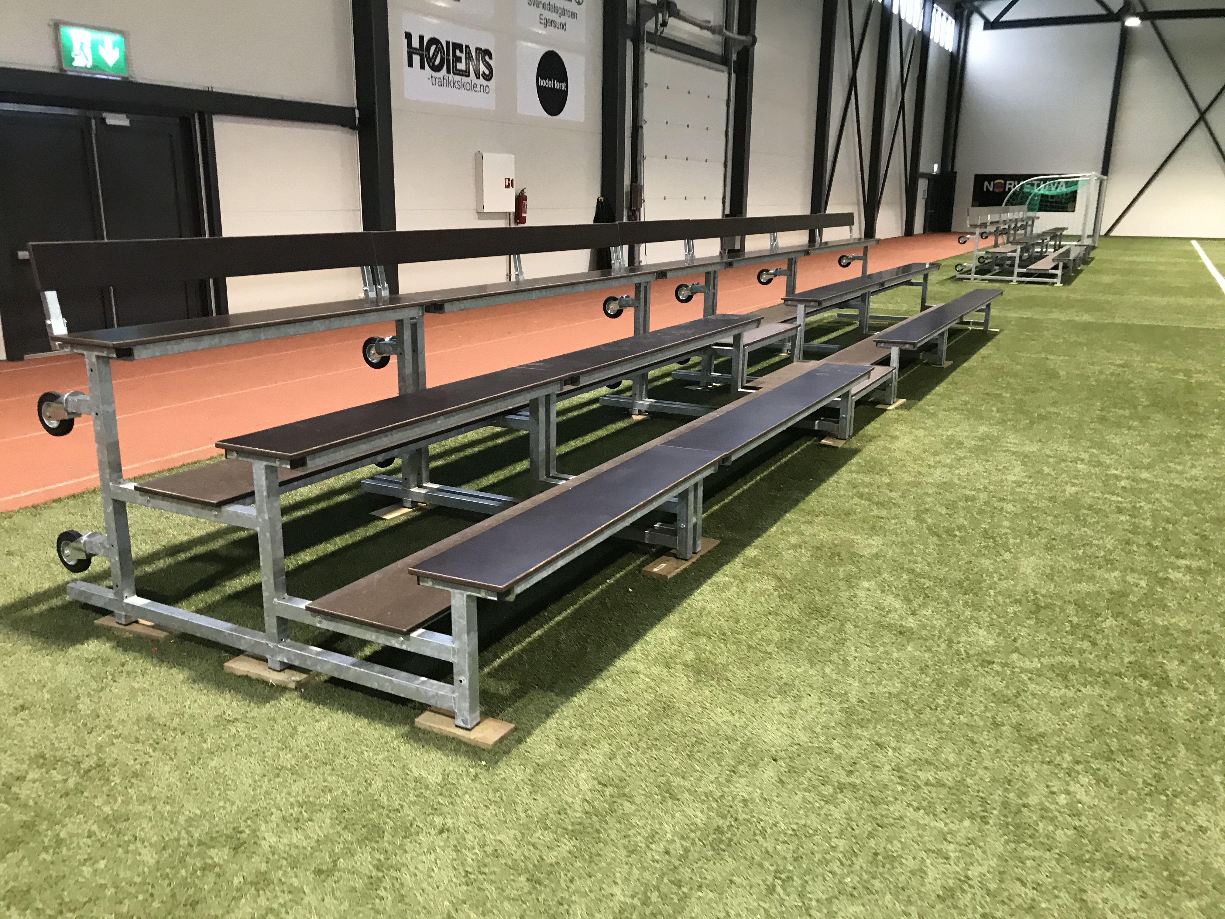 Mobil tribune for utendørs eller innendørs bruk - totalt 10 meter fordelt på 5 moduler. Tribune med 3 sitterader/benker. Utendørs: understell i galvanisert stål (innendørs lakkert stål) og utendørs eller innendørs plater i benk og trinn. En lett og enkel tribune som