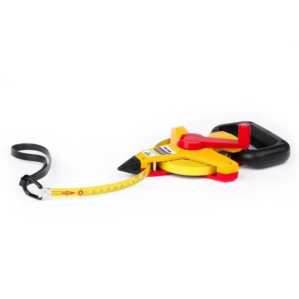 Målebånd med holder er laget av anodisert lettmetall og slagfaste plastdeler. Håndtaket har riller som gir deg et sikkert grep. Håndstroppen i fremre ende av målebåndet lar deg enkelt og bekvemt trekke båndet av rullen. Selv om du måler større avstander, rulles stålmålebåndet med sveiv raskt opp igjen.