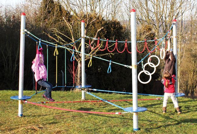 Slacklinestativ-kombinasjon 2 "Slackmaster combination 2" Slacklinestativ-kombinasjon 2 "Slackmaster combination 2" Lekeapparatet består av: 4 steel posts (Ø 102 mm), length 3.00 m, hot-dip galvanised, with plastic caps, special paint (blue) included in delivery Plastic platform (HDPE) (Ø 500