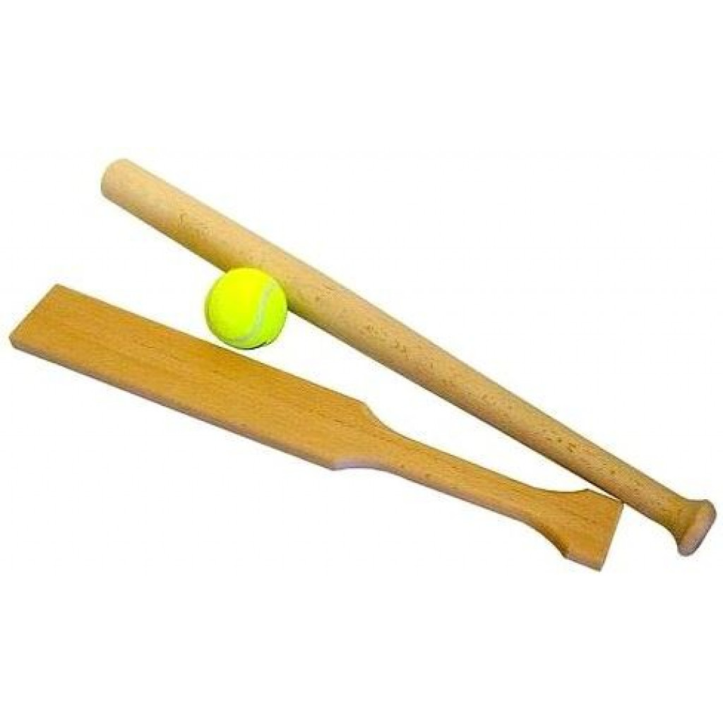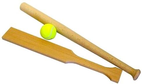 Slåballsett med 2 stk balltre, ett flatt og ett rundt i henholdsvis 50 og 60 cm. Slåballsettet leveres med tennisball. Slåball er en lek som til en
