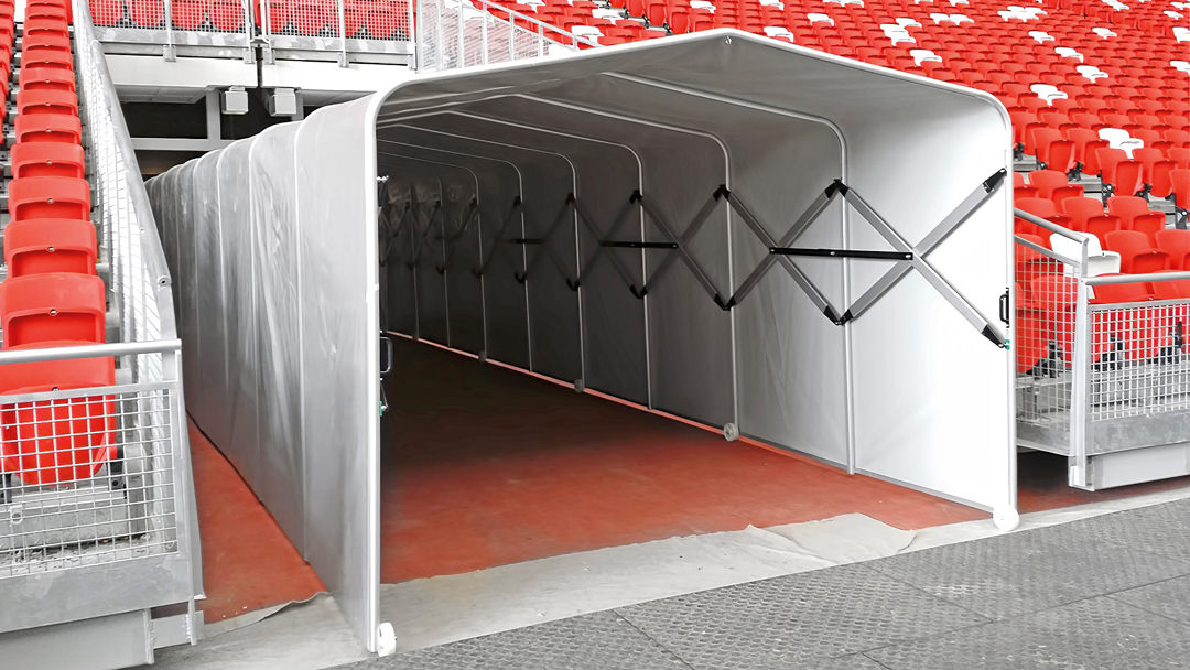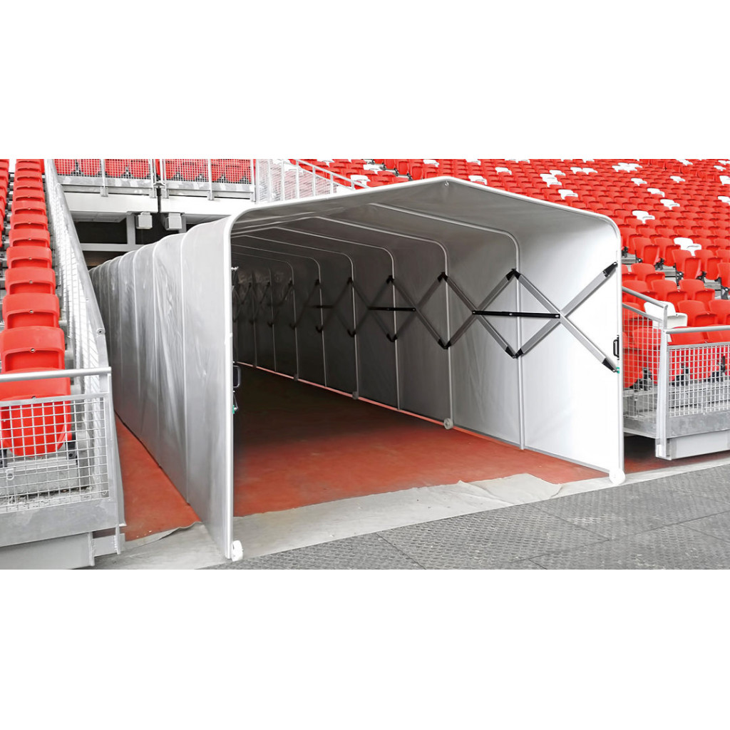 · Hver modul leveres komplett med aluminium pantografer med tilhørende strammesystem, og tunnelen kan derfor meget enkelt åpnes og lukkes. Når lukket tar den minimalt med plass og frigjør verdifull plass.