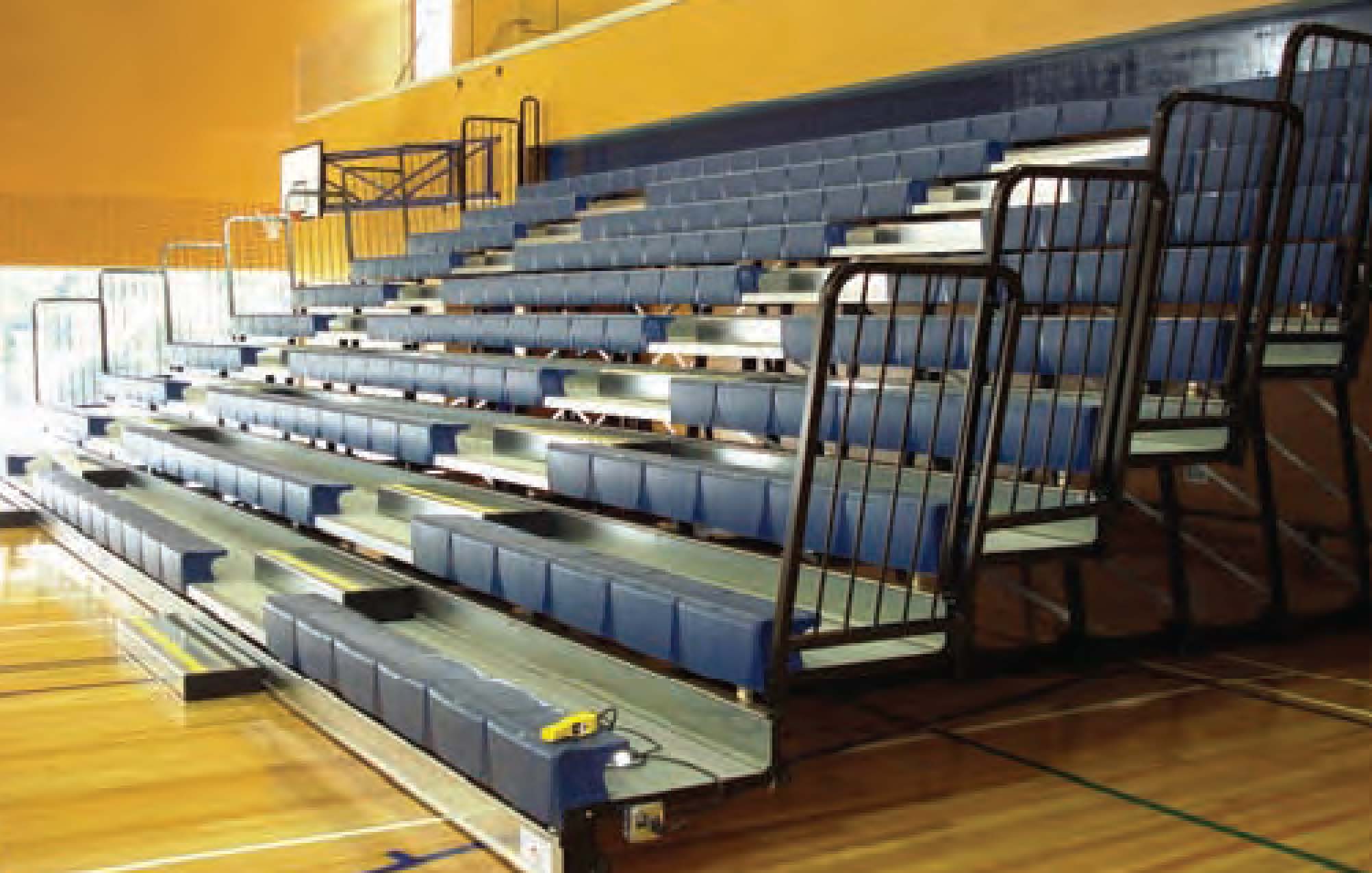 Teleskoptribune med enkle stolseter Tribunene lages etter mål og "skreddersys" til ditt behov! Denne tribunen er vårt enkle multifunksjonelle sitte alternativ for treningssentre og flerbruksanlegg. Stolen tilbyr komfortabel og sjenerøs