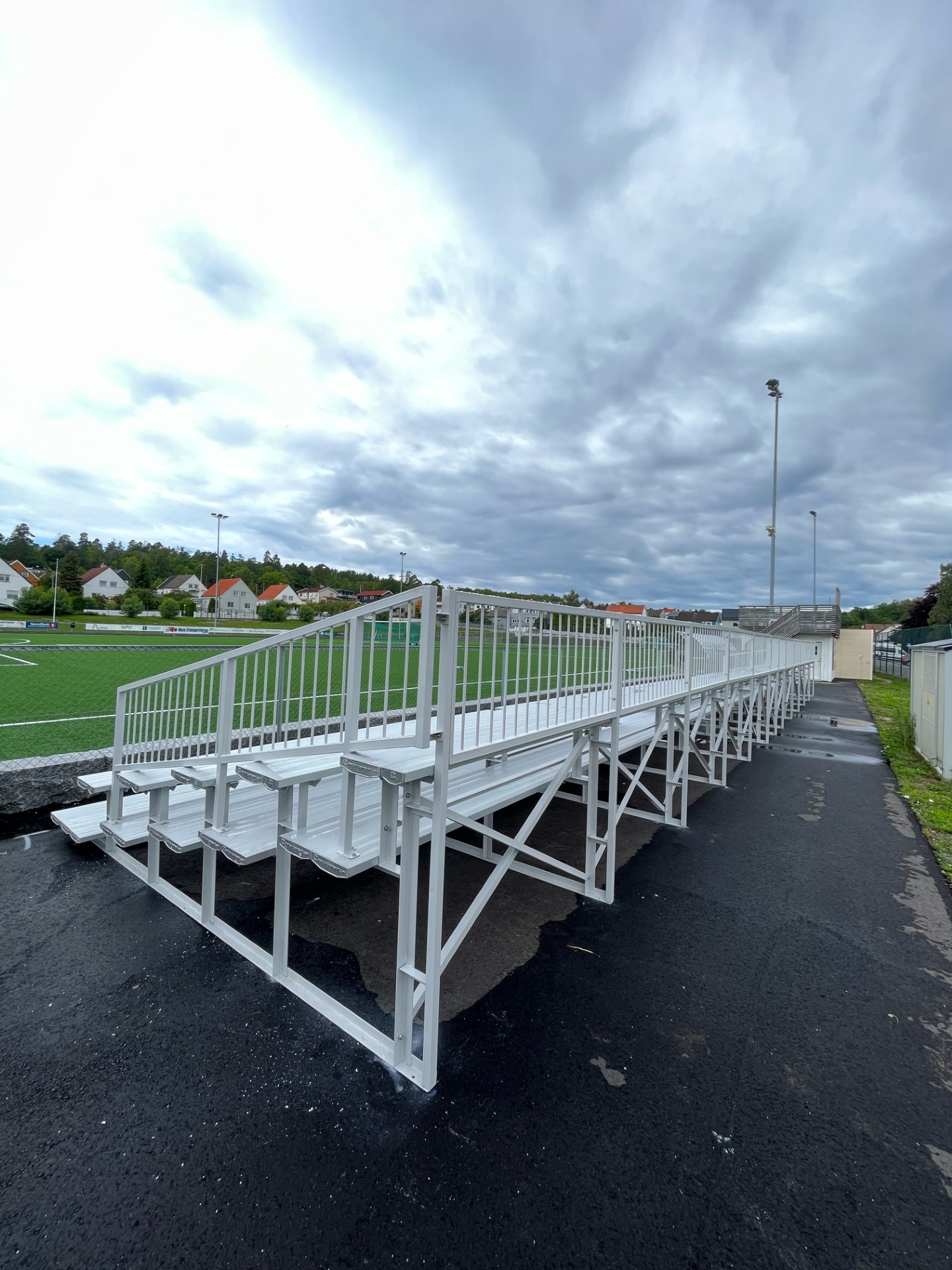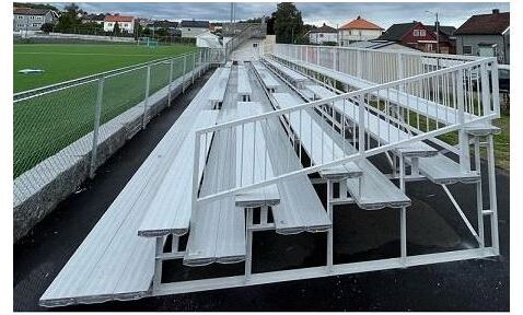 Utendørs tribune med sittebenk - kan evt. også leveres med plaststoler/seter. Tribunen leveres med gulvplater i aluminium med trinndybde 48 cm og sittebenk i aluminium med sittedybde 36 cm. Tribunene tilpasses i hvert tilfelle, så spør oss om et
