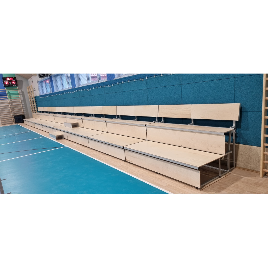 Veggmontert, manuell eller elektrisk nedfellbar tribune med frontpanel Leveres i 200-250 cm brede moduler med 2-3-4 eller 5 rader En su.. Mer