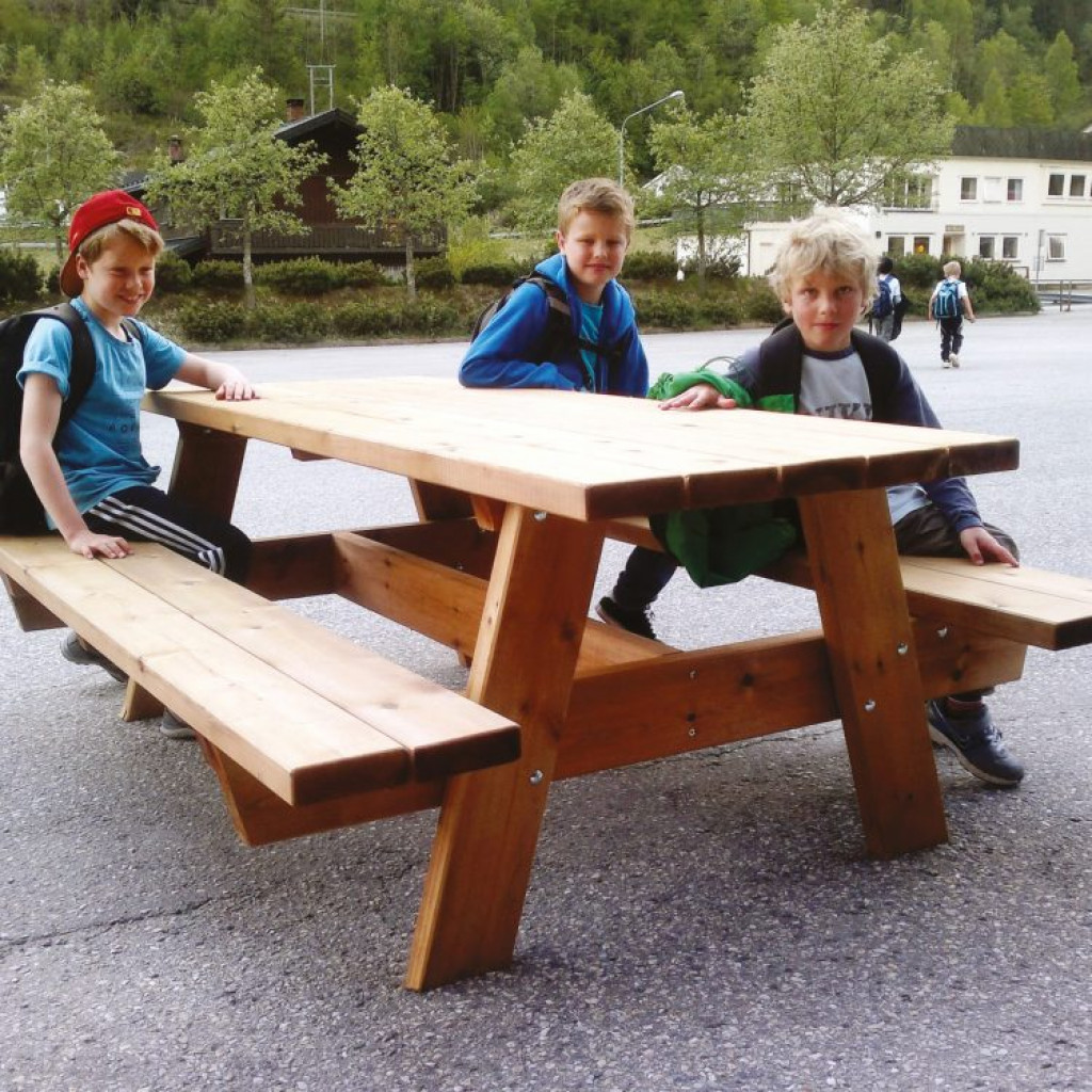 Klassisk benkbord i furu. Brunimpregnert utførelse.